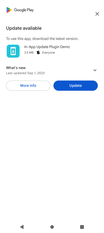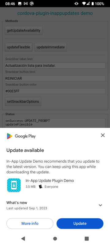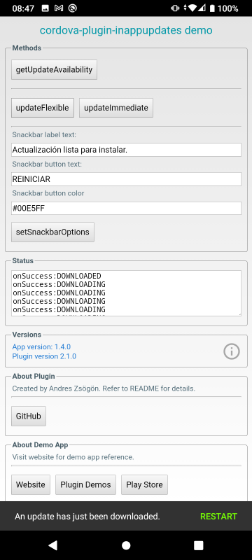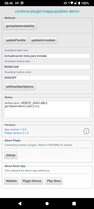 Demo app for testing the cordova-plugin-in-app-updates, which allows to check for and install updates from Play Store using the native in-app updates library. Source code available in GitHub.