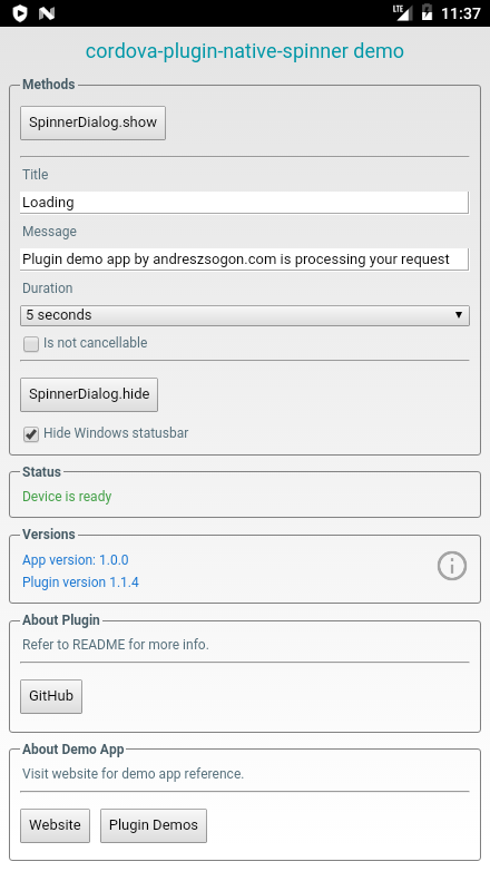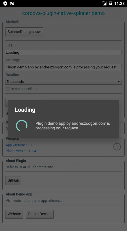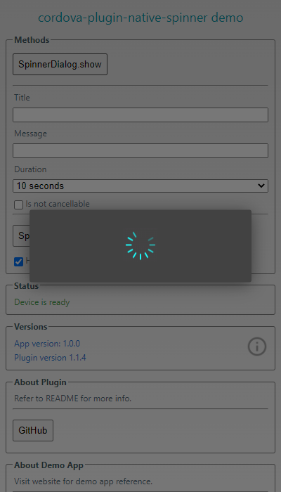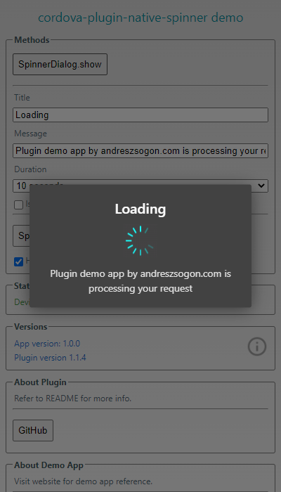 Demo app for testing the cordova-plugin-native-spinner, which allows to show a platform’s native spinner and/or message for preventing user interaction during blocking operations. Source code available in GitHub.