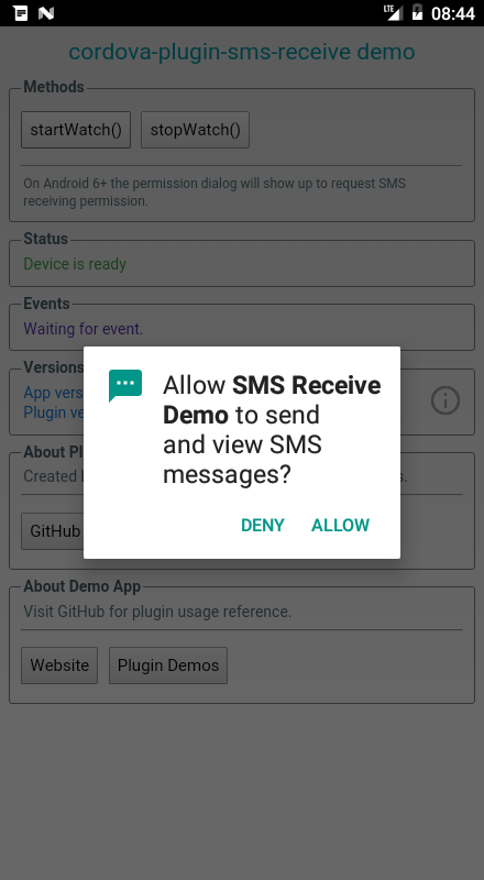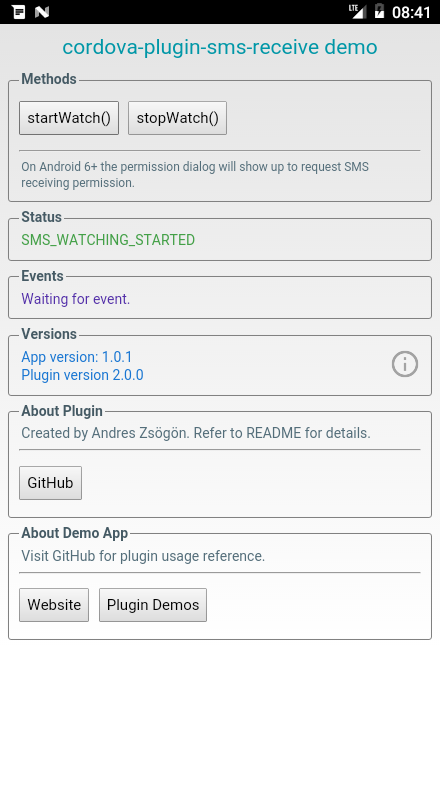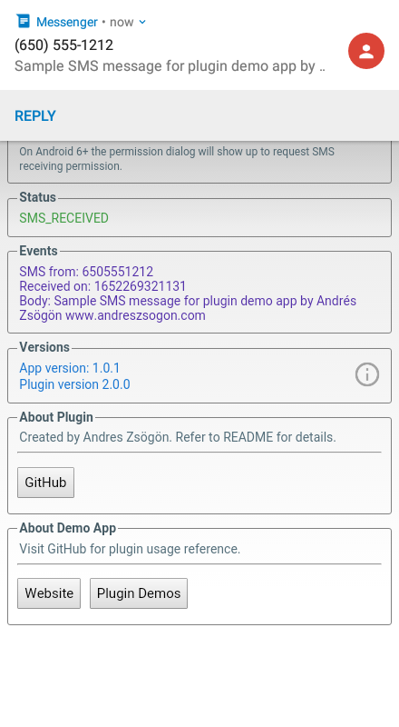 Demo app for testing the cordova-plugin-sms-receive, which allows to receive and read SMS messages using the Telephony API provided by Android. Source code available in GitHub.