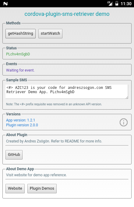 To test this plugin, open the app, get the hash string, click startWatch and send yourself a sample SMS before the 5 minute API timeout is reached. The app will intercept and read its contents, then show it in the provided textarea control.
