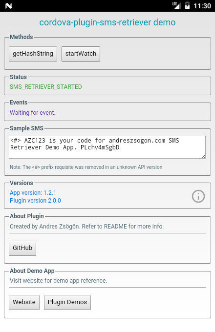 Demo app for testing the cordova-plugin-sms-retriever, which allows to receive and read SMS messages using the SMS Verification APIs provided by Android. Source code available in GitHub.