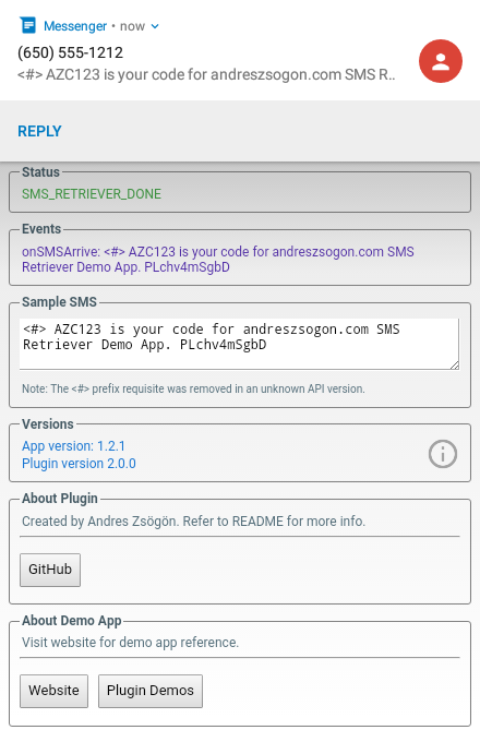 Event fired when a valid SMS is received and read by the SMS retriever API. The received SMS will be shown in the Status section.
