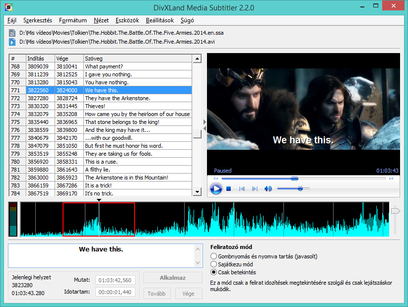 A DivXLand Media Subtitler a legjobb feliratszerkesztõ bármilyen filmhez, igazán gyorsan, egyszerûen. Freeware/ingyenes és többnyelvû, sosem volt szórakoztatóbb és könnyebb a feliratok létrehozása és szerkesztése.